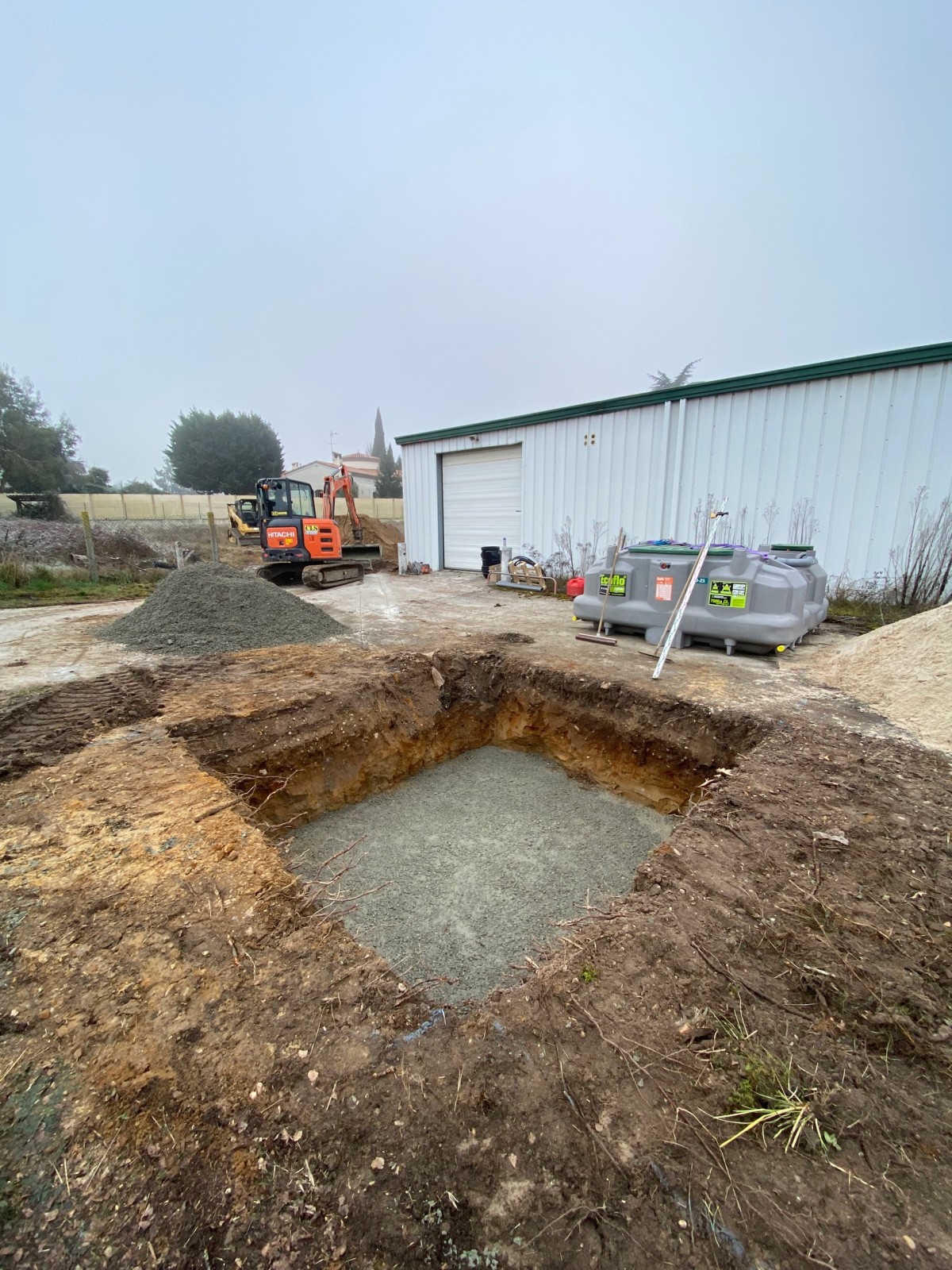 puis nous avons terrassé avec une pelleteuse l’emplacement de la nouvelle cuve ecoflo pour ensuite couler une dalle de béton .