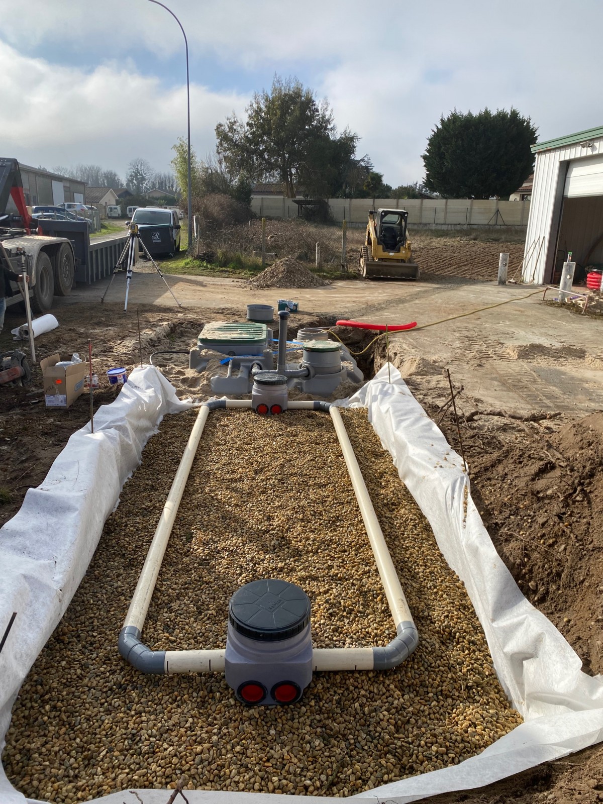 L’épandage des drains en sortie de fosse a été réalisé avec du géotextile, cailloux Garonne 16/22 et drain PVC .