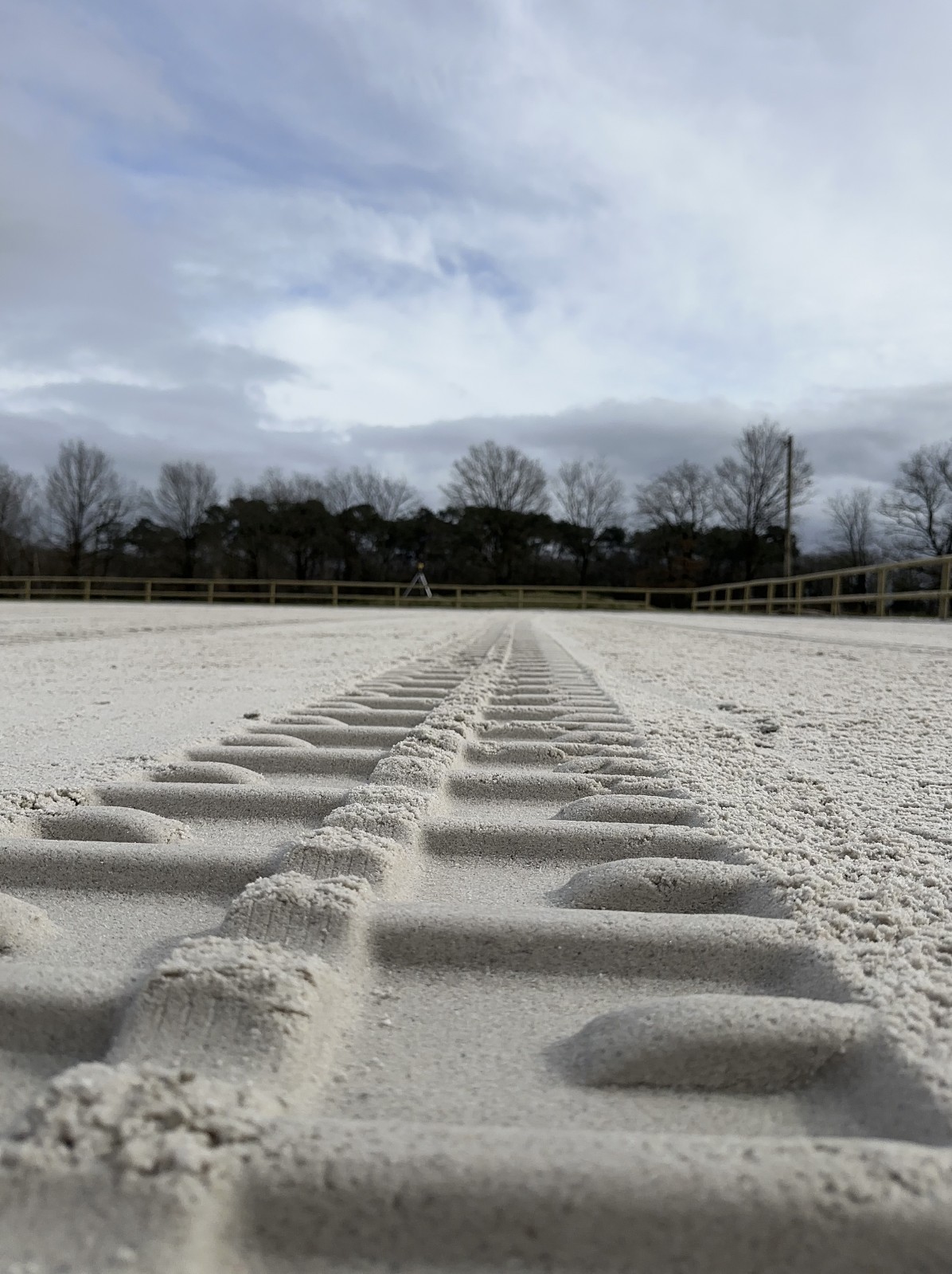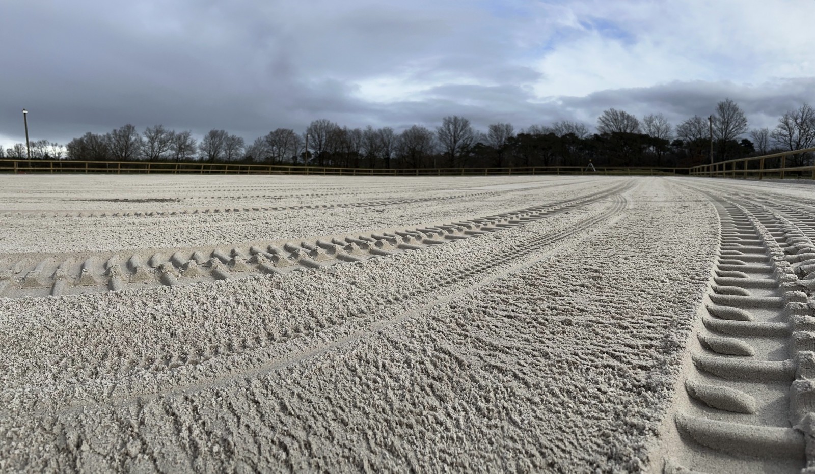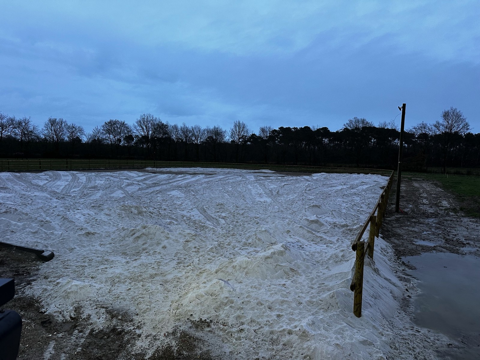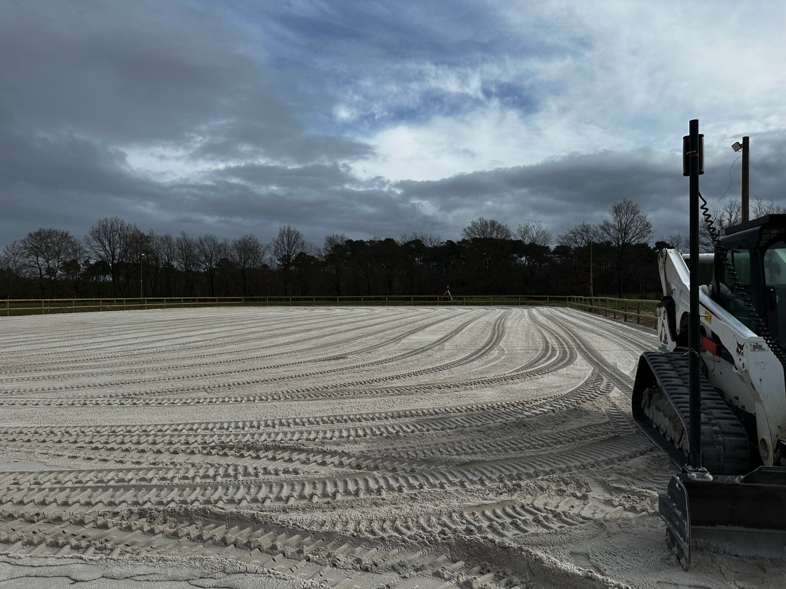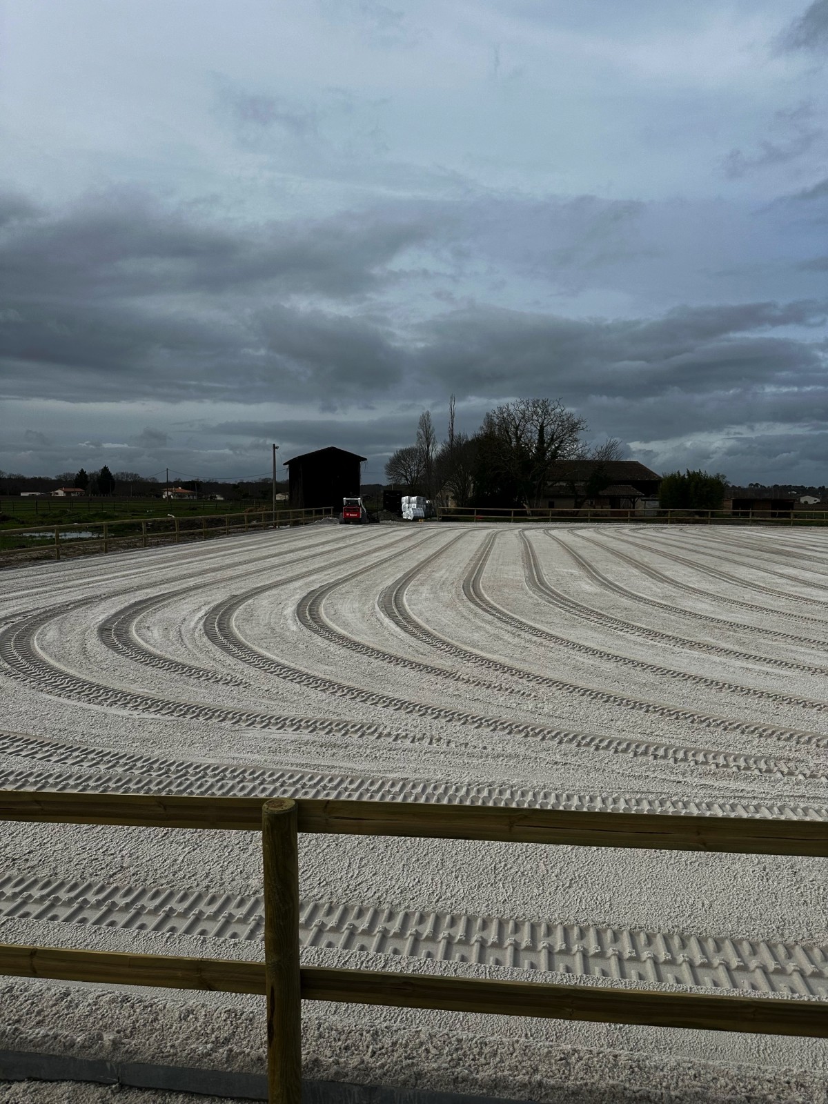 Ici nous avons réalisé une carrière équestre de 3000 m2, nous avons nivelé le sable sur 12 cm avec une pente à 0.7 %.