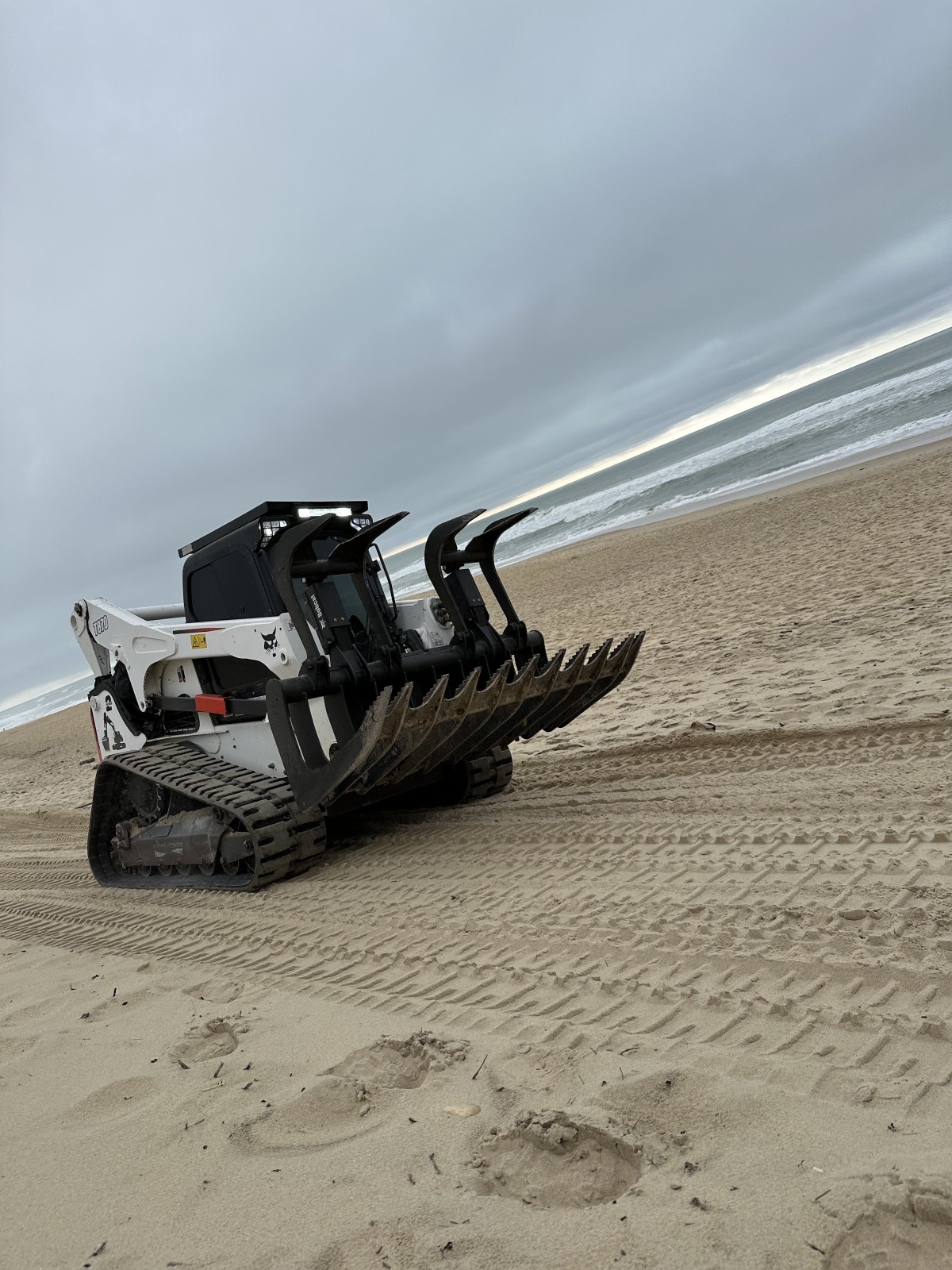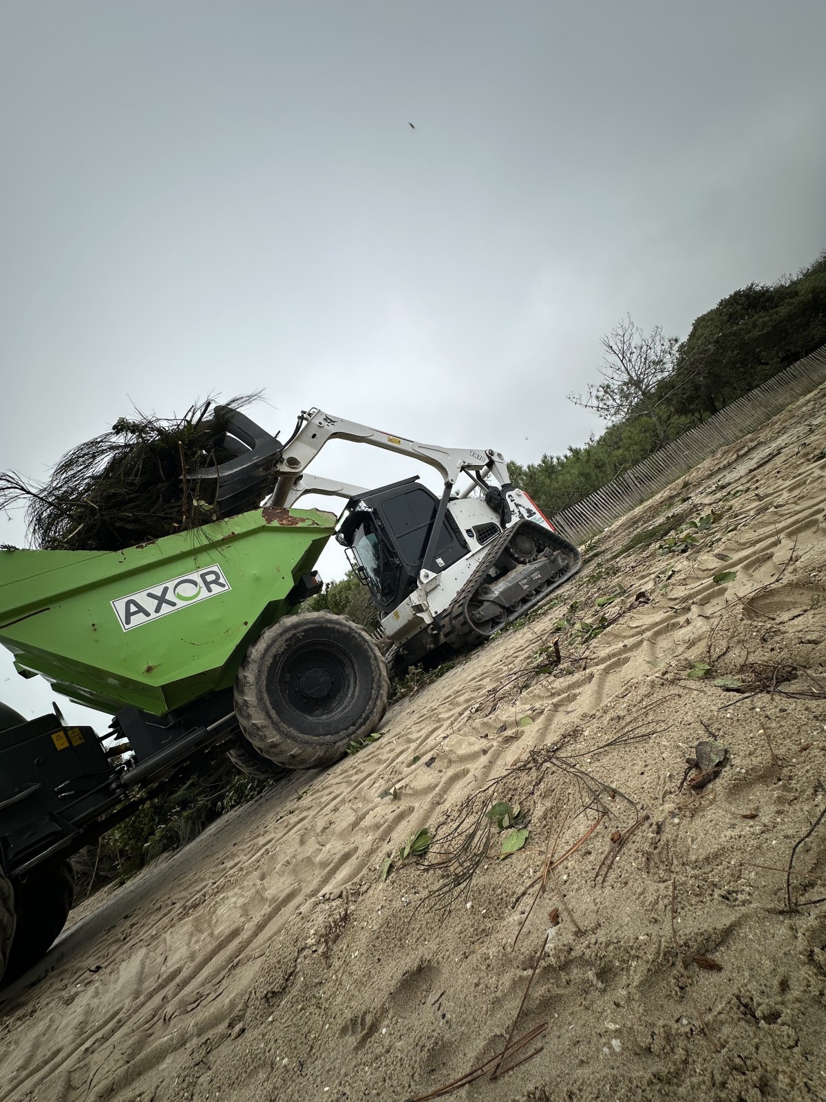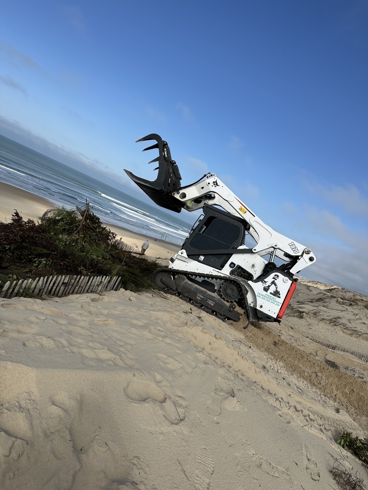 Avec notre chargeuse à chenille, nous redistribuons le paillage forestier sur les dunes pour éviter l’érosion de celles-ci.