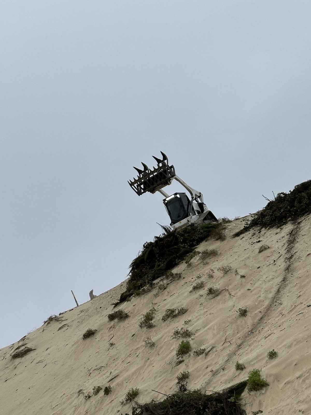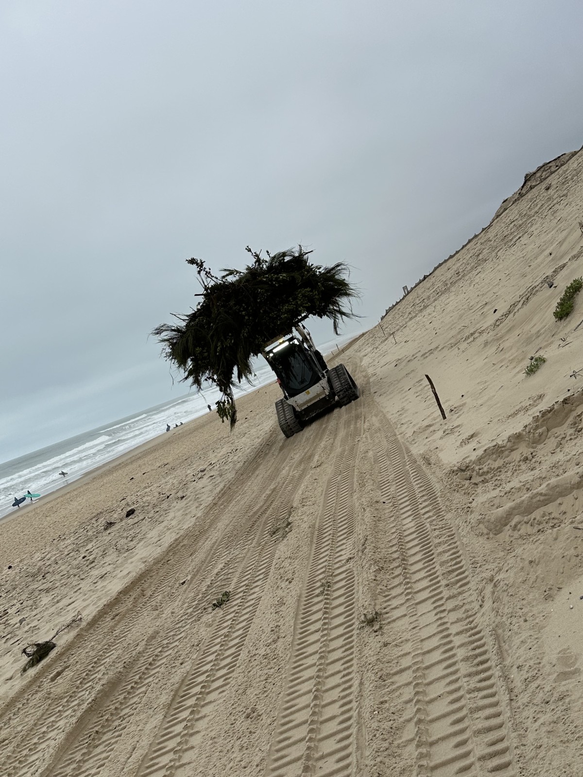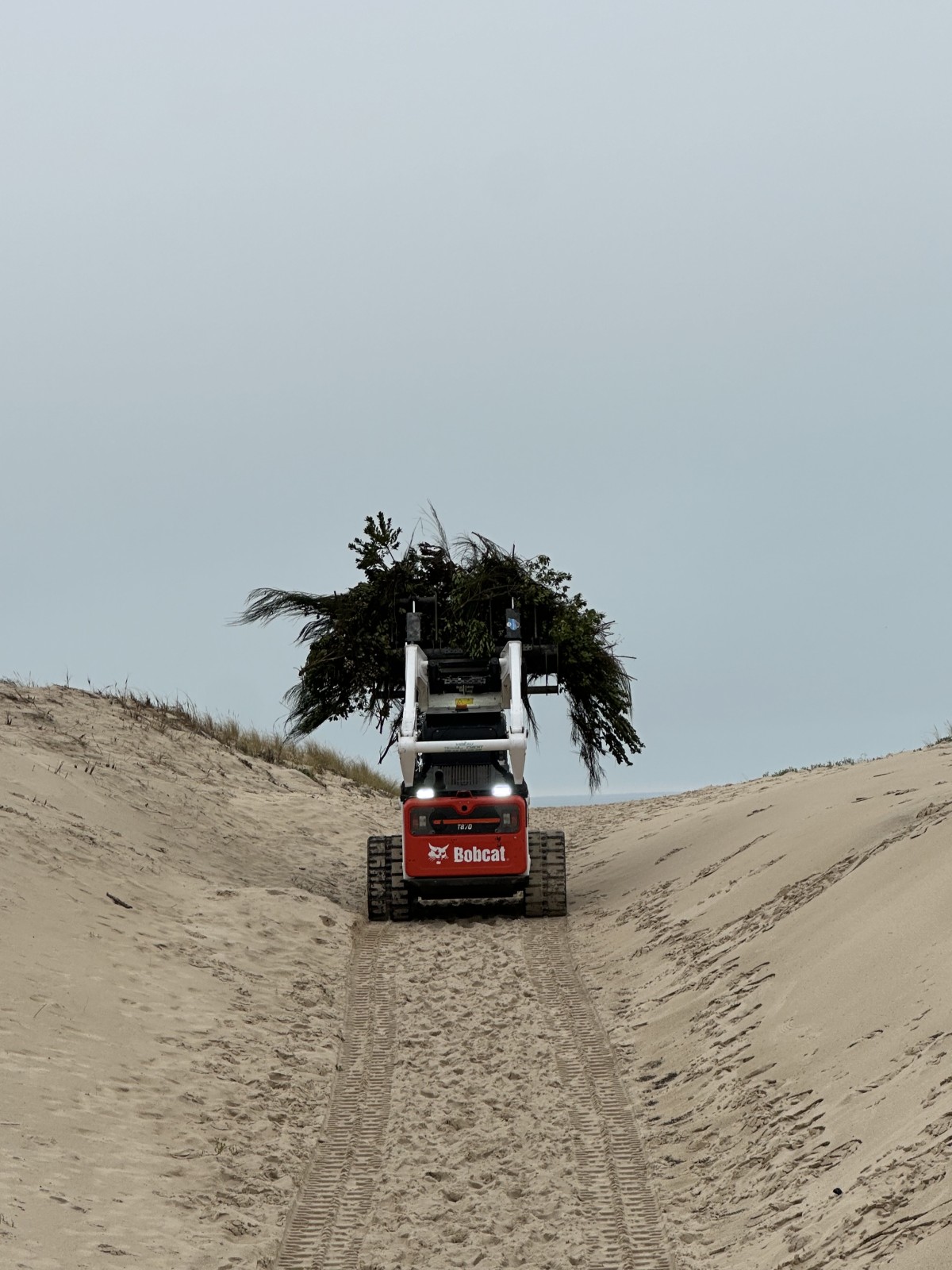 Avec notre chargeuse à chenille, nous redistribuons le paillage forestier sur les dunes pour éviter l’érosion de celles-ci.