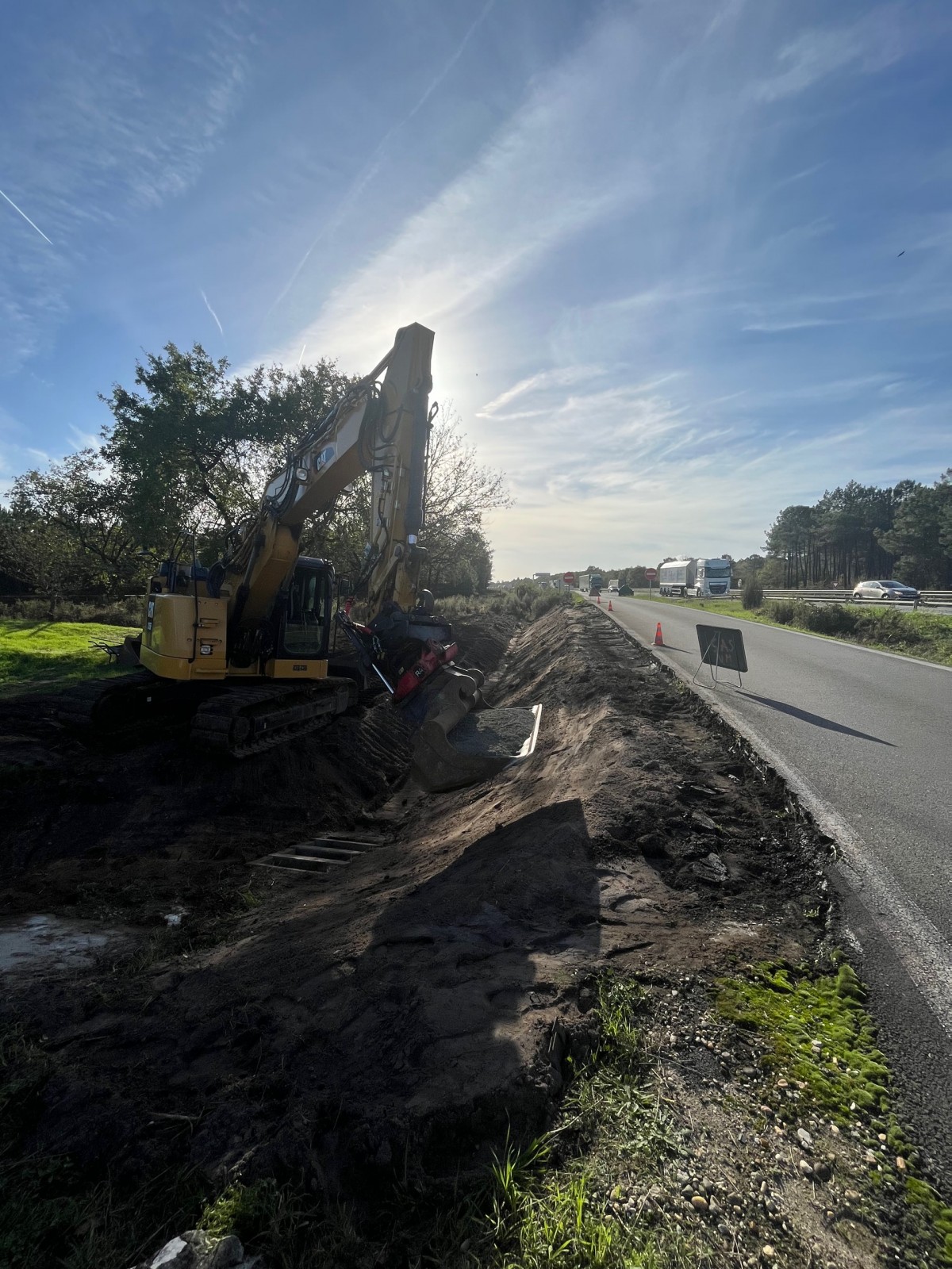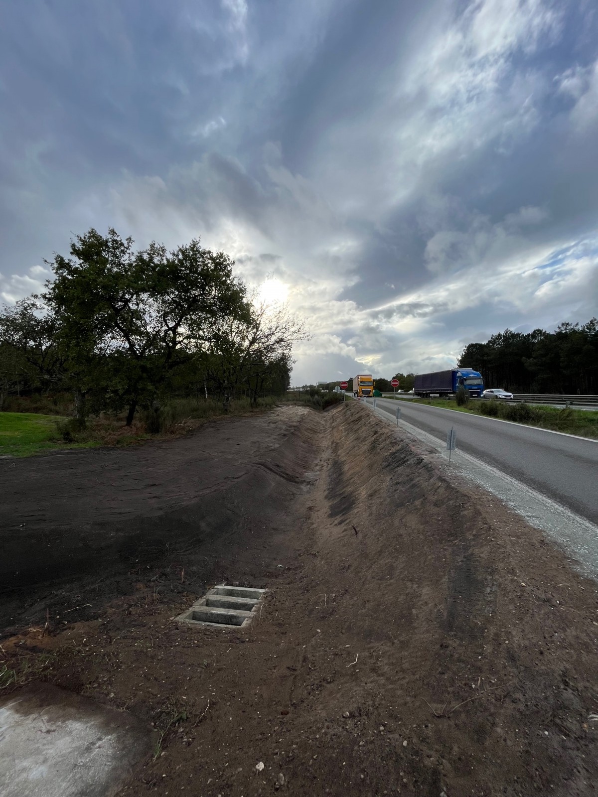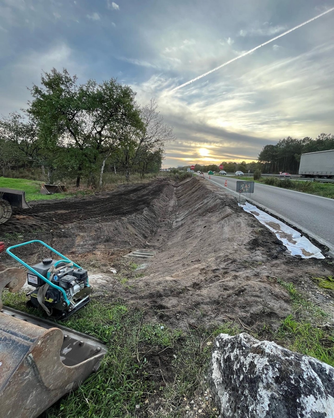 Après la mise en sécurité de la voie de décélération pour entrer sur l’air de repos de Cestas , nous avons nettoyé, déboisé, et broyé le terrain pour pouvoir reprofiler le fossé. Une fois avoir donné un nouveau profile à la noue, nous avons consolidé l’accotement avec de la diorite 0/20 et compacté l’ensemble pour la sécurité des automobilistes . Ensuite nous avons nivelé et terrassé l’ensemble du fossé avec les bonnes pentes. Enfin un nettoyage de finition avec la pelle mécanique à été fait avec soin pour pouvoir être prêt à semer le gazon .