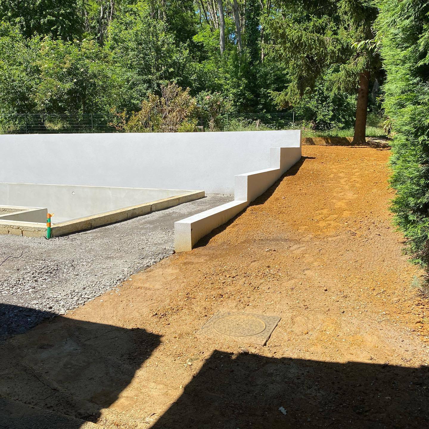 Enfin, nous avons réalisé le terrassement et l’empierrement afin de créer une assise stable et résistante pour la future terrasse piscine. L’empierrement permet non seulement d’améliorer le drainage du sol, mais aussi d’offrir une base solide pour la pose du revêtement final. Ce travail de préparation assure une longévité optimale à l’aménagement extérieur.